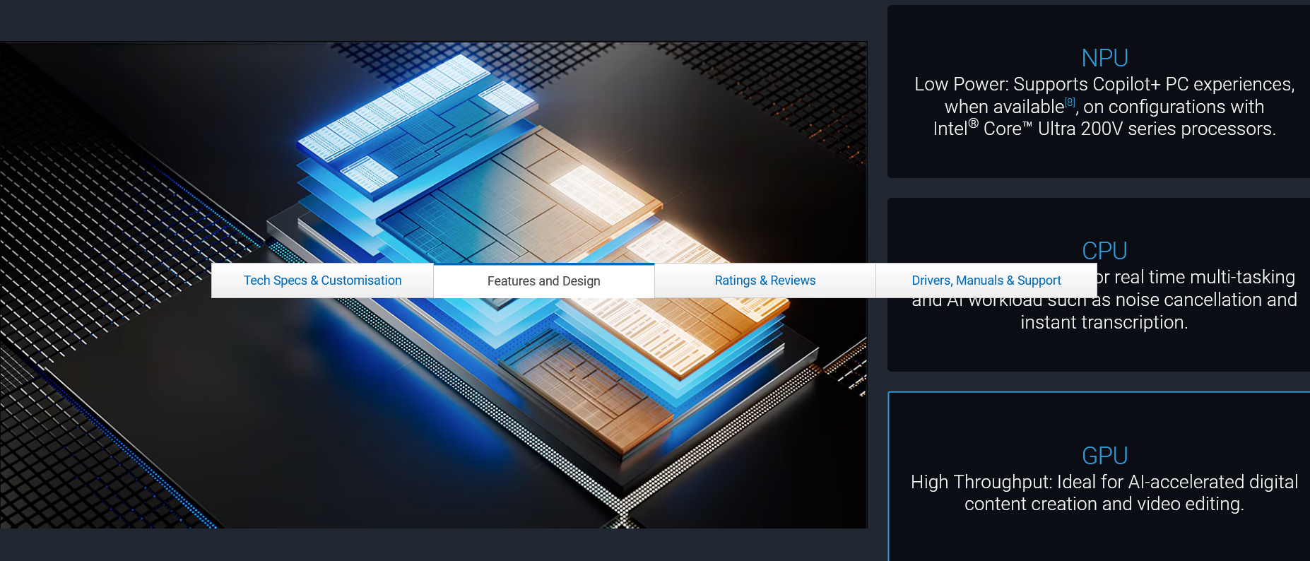 Low Power: Supports Copilot+ PC experiences, when available[8], on configurations with Intel® Core™ Ultra 200V series processors.