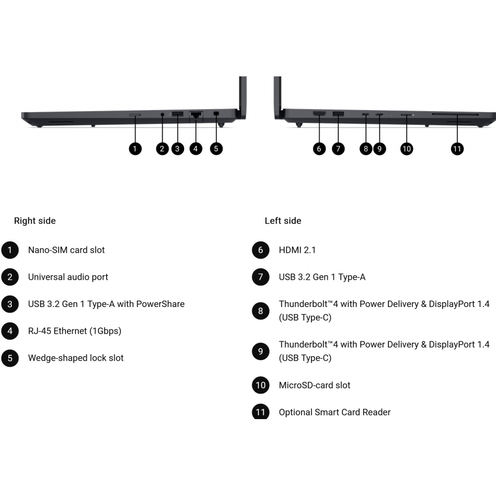 | Standard Specs And Options | STANDARD SPECS AND OPTIONS: Keyboard English UK/IRISH & Rest of Civilised World Except USA backlit Copilot key keyboard with numeric keypad Ports 2 Thunderbolt™ 4 (40 Gbps) ports with Power Delivery and DisplayPort™ 1 USB 3.2 Gen 1 (5 Gbps) port with PowerShare 1 USB 3.2 Gen 1 (5 Gbps) port 1 HDMI 2.1 port 1 RJ45 Ethernet port, 1GbE 1 Global headset port Slots 1 wedge-shaped lock slot 1 microSD-card slot 1 nano-SIM card slot (optional) 1 Smart-card reader slot (optional) Dimensions & Weight Height (rear): 0.75 in. (19.08 mm) Height (peak): 1.01 in. (25.60 mm) Height (front): 0.59 in. (15.08 mm) Width: 14.09 in. (358.00 mm) Depth: 10.08 in. (256.00 mm) Weight (minimum): 4.65 lb (2.11 kg) Touchpad Premium Precision TouchPad with Muti-touch Gesture Camera 1080p at 30 fps widescreen FHD+ RGB HDR camera, Dual-array microphones, TNR 1080p at 30 fps widescreen FHD+ RGB HDR + IR camera, Dual-array microphones, TNR 8MP HDR + IR camera, Dual-array microphones, TNR, Ambient light sensor (post-RTS) Audio and Speakers Stereo speakers with Realtek ALC1708 Audio Controller, 2W x 2 = 4W total Chassis Not Specified Wireless Intel® Wi-Fi 6E AX211, 2x2, 802.11ax, Bluetooth® 5.3 wireless card Primary Battery 4 cell, 64Whr, ExpressCharge™ Capable, standard battery Power 100W AC adapter, USB Type C |