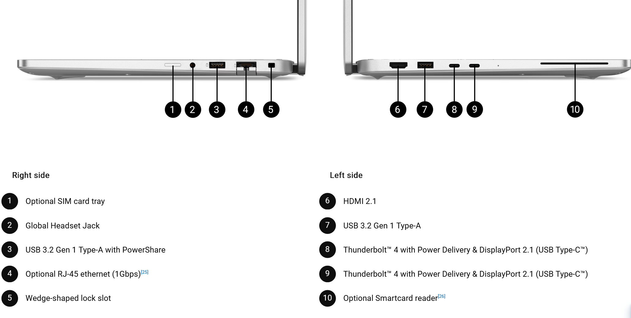 | Standard Specs And Options | Keyboard English UK backlit AI hotkey keyboard, 83-key Ports 2 x USB Type-C USB 4.0 with Power Delivery & DisplayPort 2.1 1 x USB 3.2 Gen 1 with Power share 1 x Universal Audio jack Slots 1 x Micro SD Reader Dimensions & Weight Height (rear): 16.00 mm (0.63 in.) Height (front): 15.14 mm (0.60 in.) Width: 314 mm (12.36 in.) Depth: 223.75 mm (8.81 in.) Weight (minimum): 1.53 kg (3.37 lb) Touchpad Multi-touch gesture-enabled precision clickpad Camera 1080p at 30 fps FHD RGB camera, Dual-array microphones 720p at 30 fps IR camera, Dual-array microphones Audio and Speakers 2 x top firing premium speakers, 2 x bottom firing premium speakers Qualcomm® Aqstic™ Speaker Max technology PC as a Speakerphone, AI noise reduction, Fluence Audio Chassis Exterior Chassis Materials 50% Recycled and 100% Low Carbon Aluminum Chassis Wireless Qualcomm® FastConnect™ 7800 Wi-Fi 7 2x2, BT 5.4 Wireless Primary Battery 3 Cell, 54 Wh, ExpressCharge™, ExpressCharge™ Boost Capable Power 65W AC adapter, USB Type-C, EcoDesign Palmrest Fingerprint Reader, WLAN, USB4 |